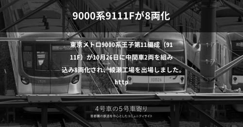 東京メトロ9000系王子第11編成(9111F)が10月26日に中間車2両を組み込み8両化され、綾瀬工場を出場しました。